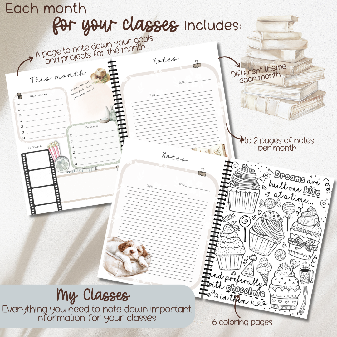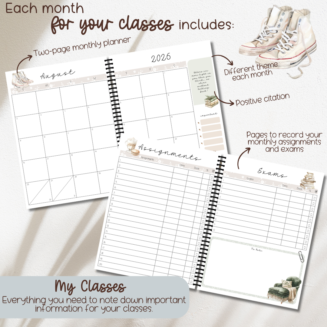 • Each month includes: two-page monthly calendar, one page for assignments, half a page for exams, one page for monthly goals, one or two pages for notes, and hourly weekly planners (6 a.m. to 9 p.m.)