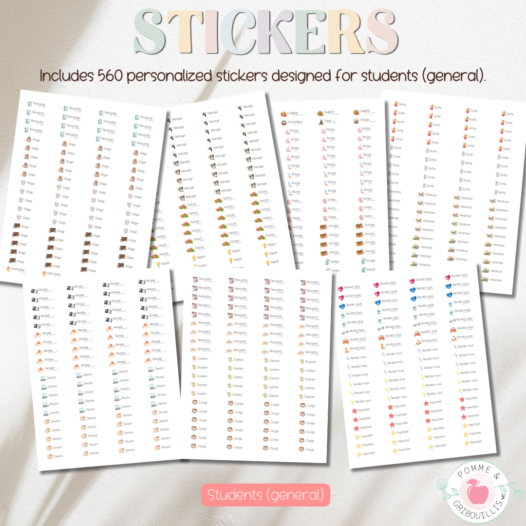 • 7 pages featuring 80 stickers each for exams, team meetings, assignment deadlines, and more